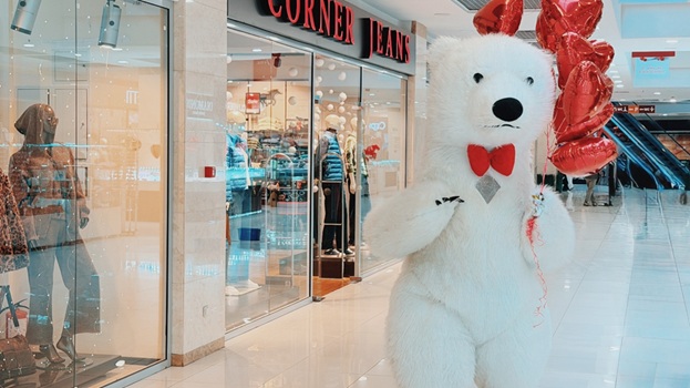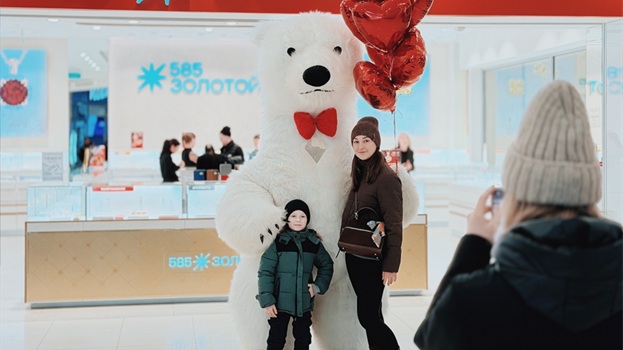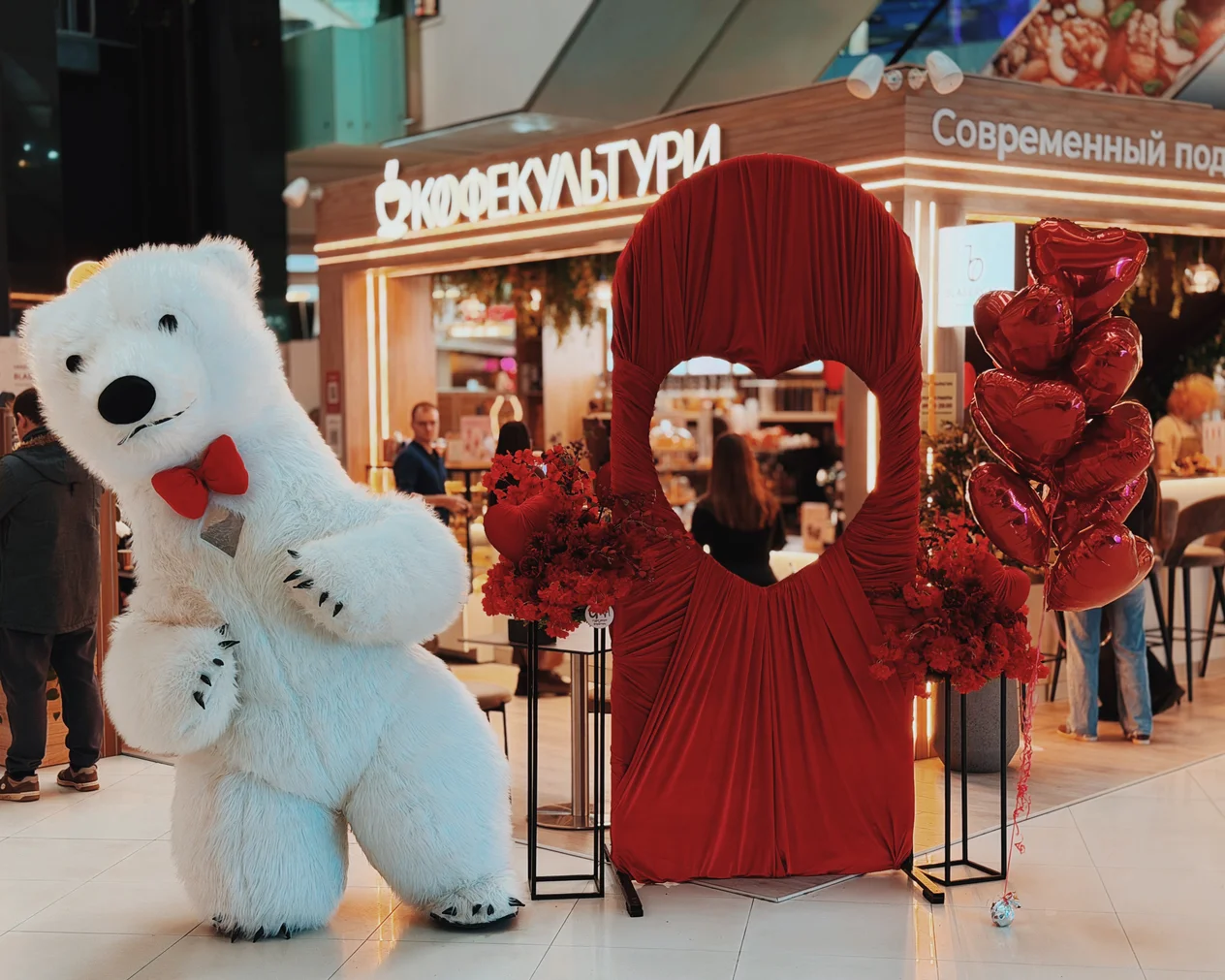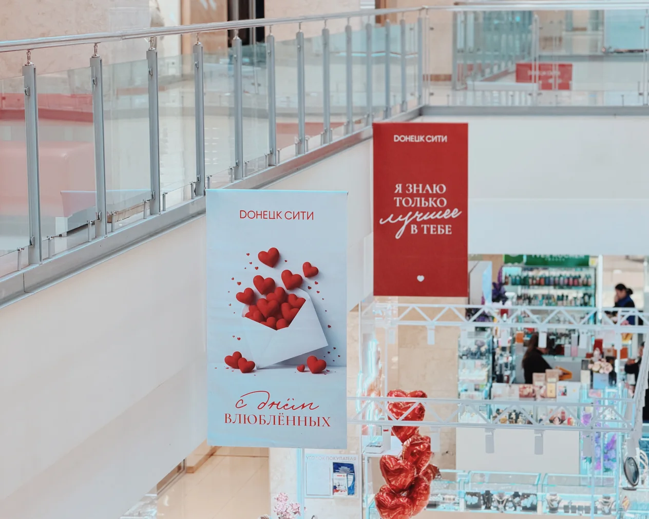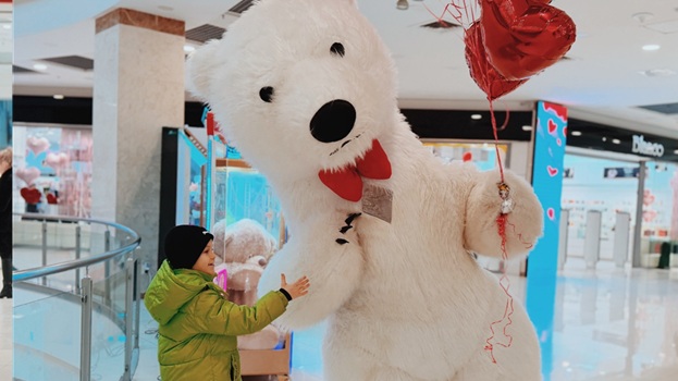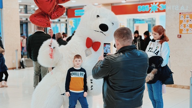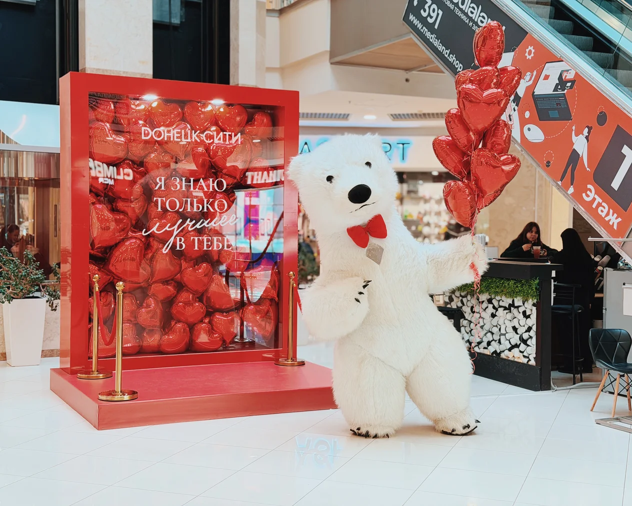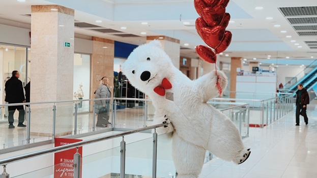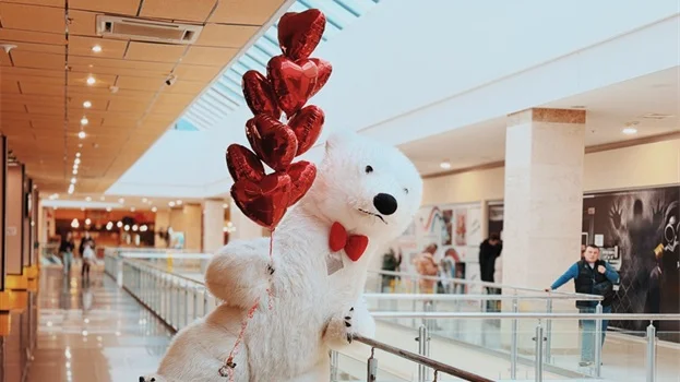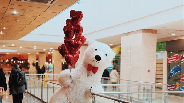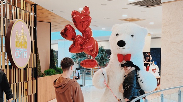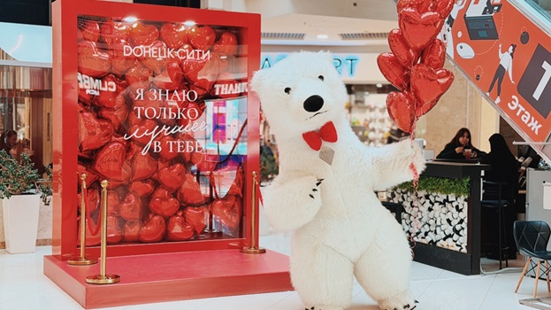 Весь день в торговом центре царила особая атмосфера: воздушные шары, гирлянды из сердец, романтическая музыка создавали настроение праздника.